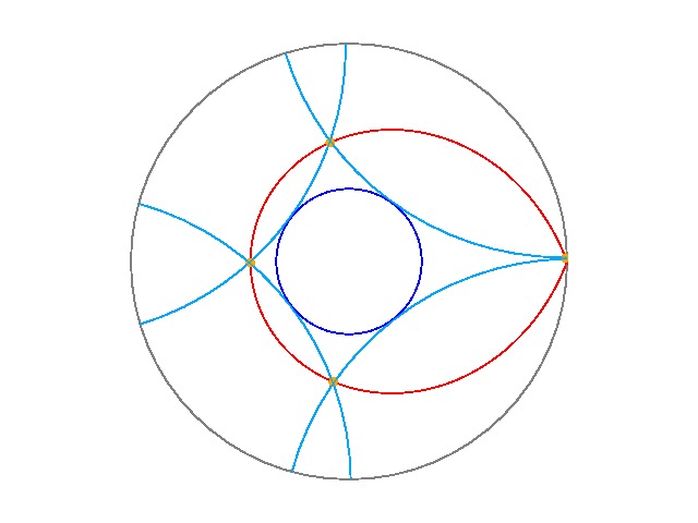下図左において空色の四角形の四辺は青い円に接し、 頂点は赤い二次曲線上にある。